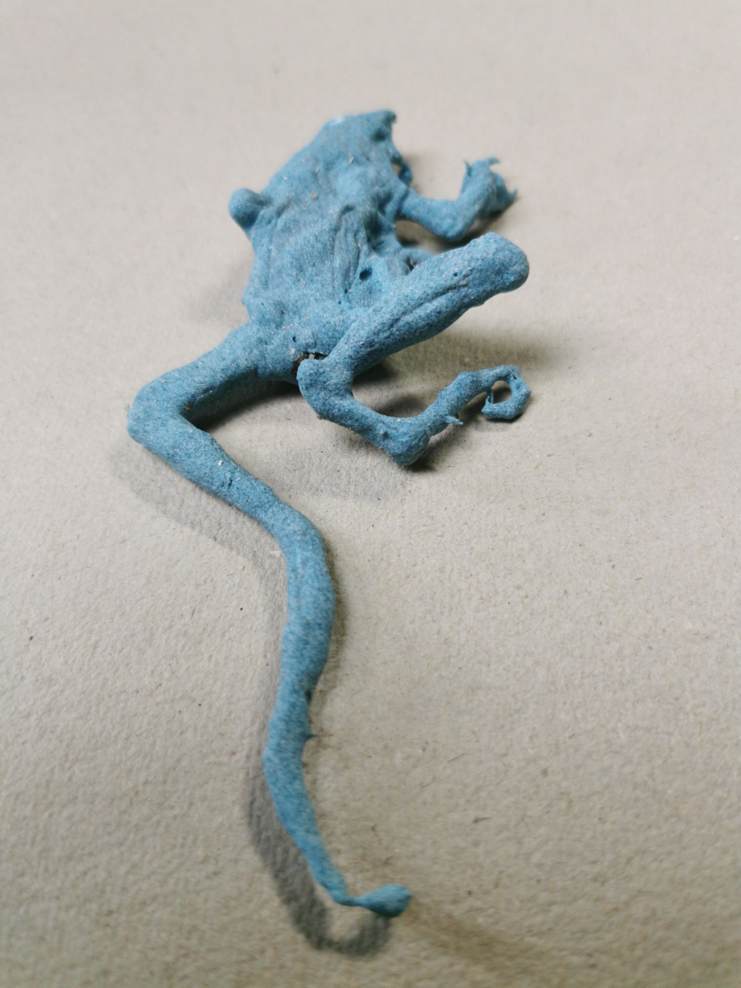 Im Frühjahr fische ich verendete Frösche aus dem Teich und lasse sie in verschiedenen Körperhaltungen mumifizieren. Ich glasiere sie mit einer Glasur, die ich so berechnet habe, dass sie nach dem Brand ohne Trägermaterial in sich stabil bleibt. Die Zusammensetzung ist ähnlich der ersten bekannten Glasur unserer Kulturgeschichte, dem Ägyptisch Blau, mit welchem auch die Uschebti ab der 12. Dynastie glasiert waren.